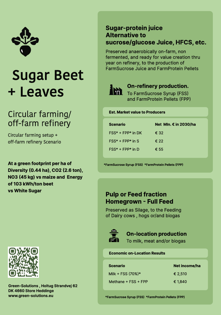 agriculture while reducing environmental impact. The business model is demonstrated through Scenario 3A, involving a platform of 30 farms (see poster below). Each farm performs on-site juicing and storage, with downstream upgrading at a centralized facility. The remaining beet and leaf pulp are retained for milk or methane production, creating an integrated and circular system. Scenario 3A has been financially modelled using conservative yield and pricing assumptions. Results show positive net returns per hectare in both dairy and biogas pathways—without reliance on state subsidies. The model captures multiple revenue streams while reducing input costs, offering an attractive risk-return profile at farm and portfolio level. Patents are secured in Europe, the U.S., and Eurasia, with scalability potential across sugar beet-producing regions, particularly in Northern and Eastern Europe. In terms of impact, Scenario 3A: